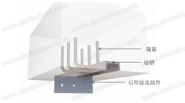 二是通槽式埋件,此種埋件主要用于建筑兩側,與弧形屋面垂直相交金屬框架玻璃幕墻的龍骨連接。通槽式埋件面板即作為玻璃固定鋼槽使用,也作為幕墻立柱連接件的生根點。幕墻龍骨連接件可以在槽式埋件里滑動,達到調解目的。