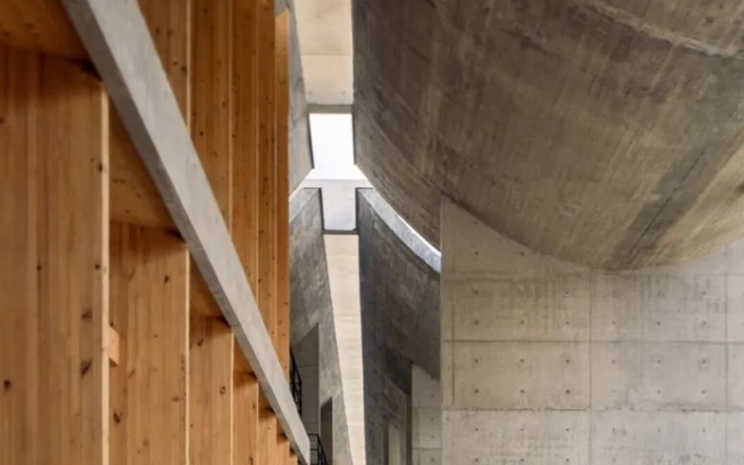 如同前文描述,項目所有的外露混凝土都是一體澆筑成型。混凝土構造兼做建筑結構體系,也作為圍護體系。混凝土完成面即為建筑裝飾面,不論是室內室外基本不做更多的裝飾裝修。這對建筑幕墻的設計和建造提出了更嚴苛的要求,特別是幕墻龍骨或面板與主體結構的連接處理和預埋處理尤為重要。同時本建筑群會議中心部分采用了大面積的木質龍骨幕墻,木龍骨規格形狀大小不一,最大的截面高度大于1米。在項目設計和建造時,國內還沒有相應的木質龍骨幕墻設計規范,這也為后期采用木質龍骨玻璃幕墻的項目提供了經驗和參考。