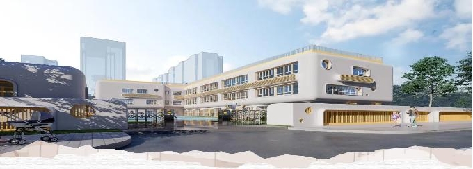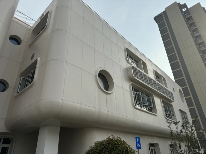 本項目采用獨特的圓型窗和圓弧造型外維護構造設計,旨在突破傳統(tǒng)建筑形象,體現(xiàn)“宇航空間”的神秘感和科技感,為幼兒園注入更多的趣味性和想象力。圓弧形的線條不僅使建筑外觀更加柔和、生動,還能有效引導自然光線的進入,提高室內的采光效果。同時,這種設計還增強了建筑的整體美感和視覺沖擊力,使孩子們仿佛置身于一個充滿童話色彩的太空世界中。