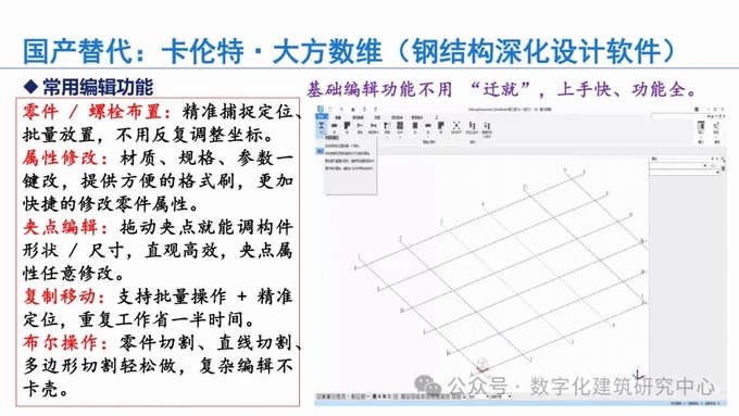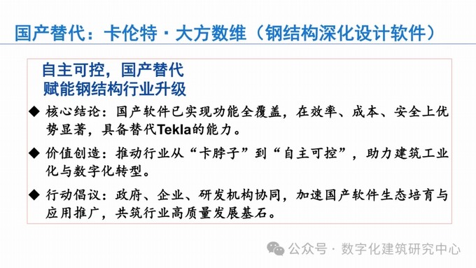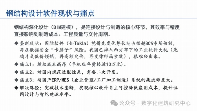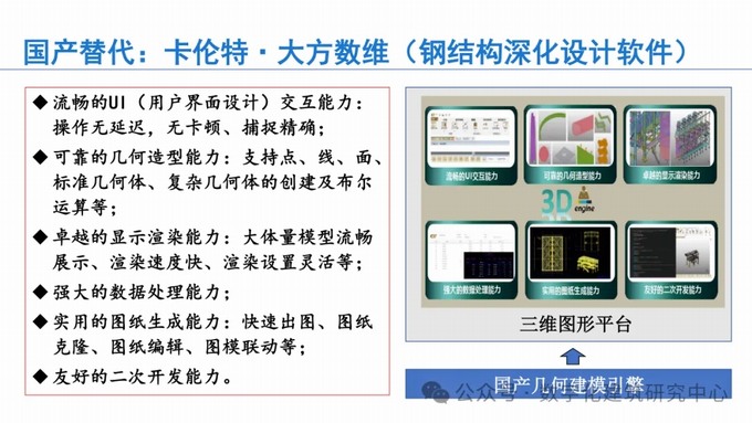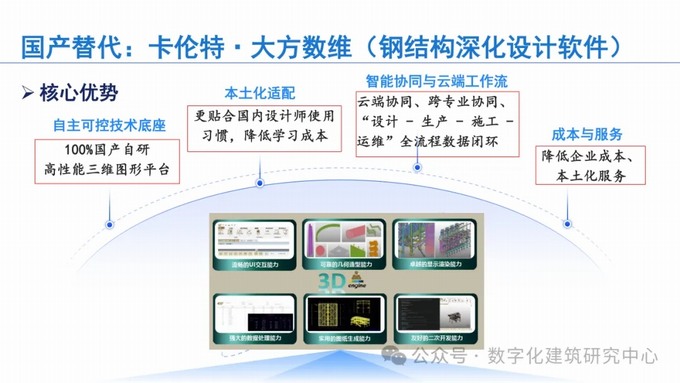 編者按:9月13日,在2025鋼結構發(fā)展前沿技術研討會上,林樹枝博士做了“鋼結構BIM建模軟件國產化替代”的主題報告,報告詳細闡述了解決工業(yè)設計軟件“卡脖子”問題的重大意義。介紹國內自主研發(fā)的鋼結構深化設計軟件“卡倫特·大方數維”的突出優(yōu)勢:100%國產高性能三維圖形平臺,云端協(xié)同,多專業(yè)覆蓋,“設計-生產-施工-運維”全流程數據閉環(huán);通過核心技術自主可控,打破國外技術壟斷,實現從“跟跑”到“領跑”的跨越;助力鋼結構行業(yè)實施深化設計軟件的全面國產化替代,賦能鋼結構行業(yè)轉型升級及高質量發(fā)展。報告內容豐富,資料翔實,有較高的技術含量。經征得林樹枝博士同意,特分享如下: