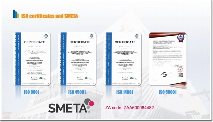 目前,嘉好已通過ISO9001 / ISO14001 / ISO45001 / ISO50001 / IATF16949等管理體系認證,以及SMETA社會責任審核。