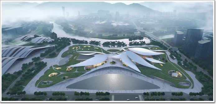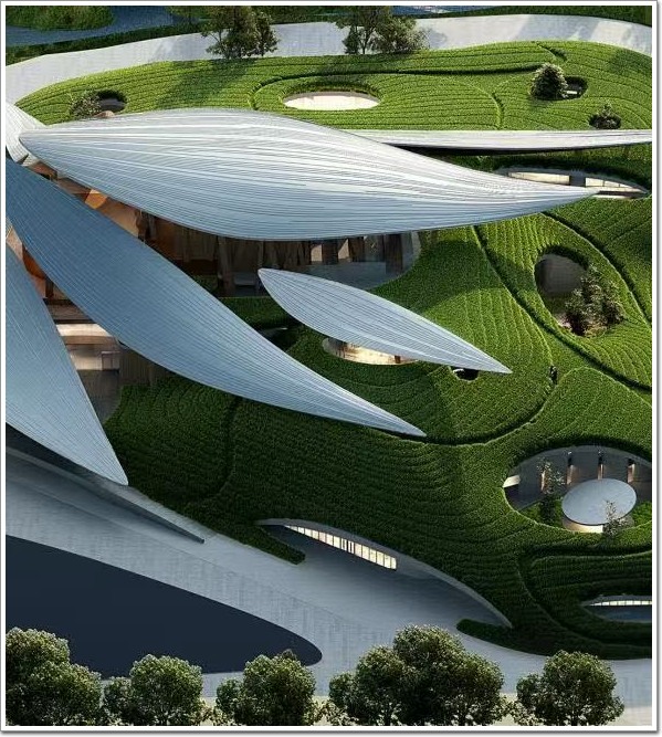 安吉"兩山"未來科技城文化藝術中心總建筑面積達11.89萬平方米,由12片形似竹葉的異形曲面結構金屬屋面形成層疊錯落自然建筑形態,白色金屬葉脈在陽光下閃爍著銀白色的光芒,與周圍綿延的茶田竹海交相輝映,完美詮釋了"建筑生于自然"的設計理念。