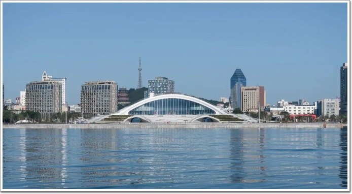 立面設計強調地景建筑的流動曲線,通過參數化設計大量應用雙曲面UHPC(超高性能混凝土(詞條“混凝土”由行業大百科提供)),精準勾勒出“巨鯨拱背”的建筑意象。UHPC材料兼具高強度、輕質與極佳耐久性,其溫潤的質感呼應了北方濱海環境,顯著降低了后期維護成本,經濟性突出。東側高達40米的“巨鯨之眼”通高幕墻,采用精致鋼支撐體系,以中國傳統園林“框景”手法,將劉公島美景納入建筑,成為視覺焦點。