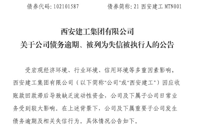 近日,西安建工集團有限公司發(fā)布《關(guān)于公司債務(wù)逾期、被列為失信被執(zhí)行人的公告》,根據(jù)該公告顯示: