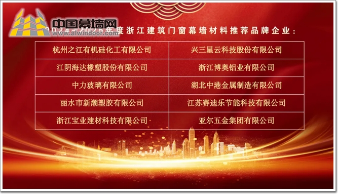 杭州之江有機(jī)硅化工有限公司、興三星云科技股份有限公司、江陰海達(dá)橡塑股份有限公司、浙江博奧鋁業(yè)有限公司、中力玻璃有限公司、湖北中港金屬制造有限公司、麗水市新潮塑膠有限公司、江蘇賽迪樂節(jié)能科技有限公司、浙江寶業(yè)建材科技有限公司、亞爾五金集團(tuán)有限公司。
