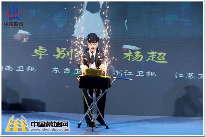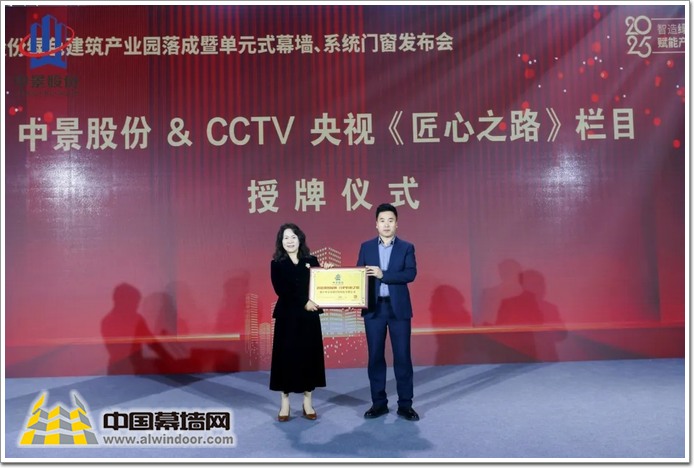 CCTV央視《匠心之路》欄目采編負責人霍英波先生上臺,向浙江中景幕墻科技股份有限公司副董事長周昭娟女士授牌。