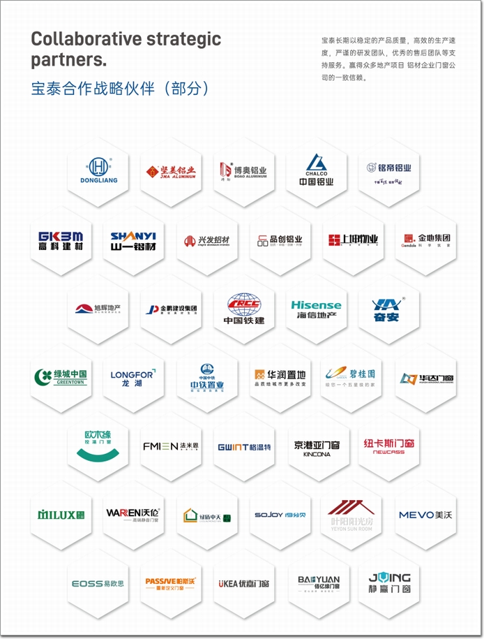 樹·口碑|寶泰始終堅定信念,不忘初心,秉持“賦能中國好門窗“的使命而不懈精進,與上下產業鏈的眾多企業建立起良好的戰略合作關系。它們當中有華潤置地、旭輝地產等;有中國鋁業、興發鋁材、廣亞鋁材、奮安鋁材等;有米蘭之窗、法米恩系統門窗、沃倫系統門窗、華達門窗等。