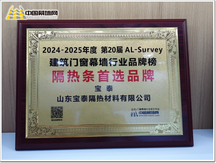 山東寶泰隔熱材料有限公司是一家集科研開發、工程塑料改性、制造加工于一體的科技型企業。在2024年的突破進取中,不斷挑戰,不斷創新,收獲了市場的好評,也贏得廣大終端客戶、行業專家、房地產企業、設計院、顧問公司的高度認可,在第20屆AL-Survey2024-2025門窗幕墻行業數據調查活動中,再次榮獲“隔熱條首選品牌”大獎!