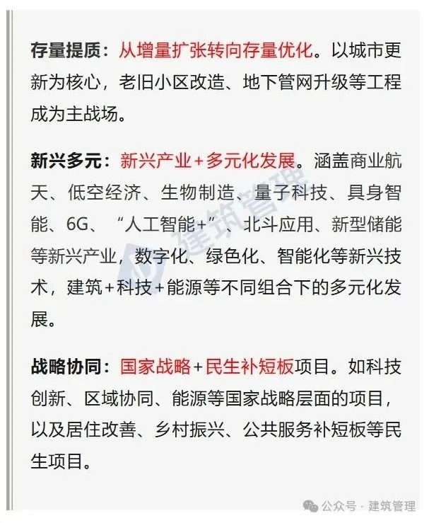 擁抱行業(yè)變化:從2025年的《政府工作報(bào)告》可以看出建筑業(yè)的趨勢(shì)與房地產(chǎn)蓬勃發(fā)展期相比發(fā)生了巨大的改變,未來(lái)的工程項(xiàng)目將傾向于“存量提質(zhì)、新型多元、戰(zhàn)略協(xié)同”。哪里有變化,哪里就有項(xiàng)目,哪里才有活兒干。