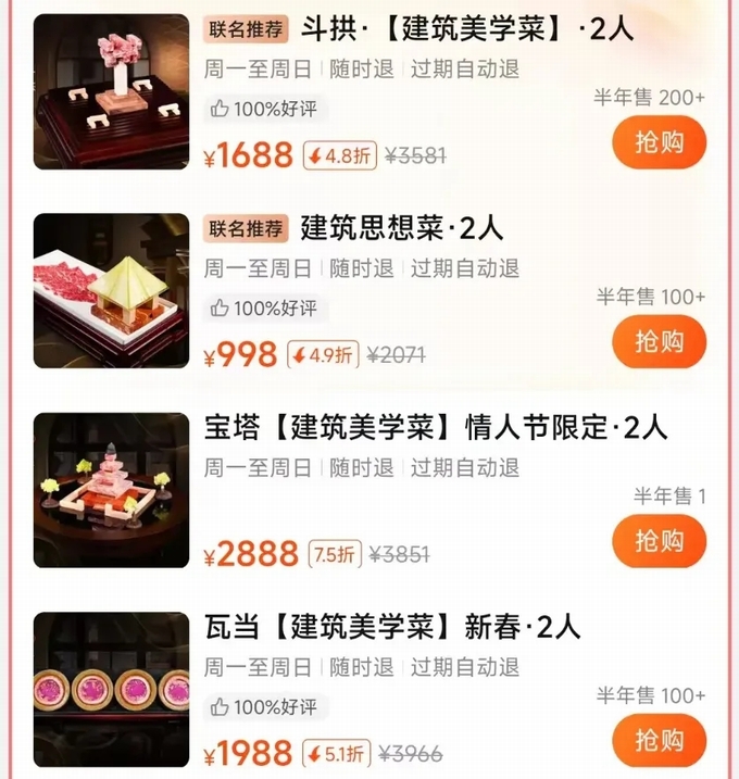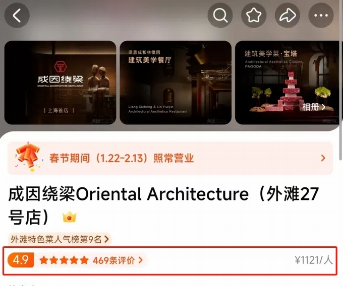 還有一個(gè)成功案例建筑+餐廳,最近,上海外灘27號(hào)的“成因繞梁Oriental Architecture”餐廳火了,這家店是2024年開(kāi)業(yè)的,由建筑設(shè)計(jì)團(tuán)隊(duì)與米其林廚師聯(lián)合打造,以 “可食用的建筑史” 為核心理念,人均上千,并且評(píng)分極高。