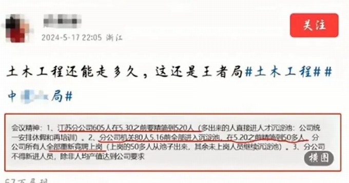 中字頭工程局領(lǐng)導(dǎo)喊話,要求全局干部員工深刻認(rèn)識(shí)當(dāng)下建筑行業(yè)極其嚴(yán)峻的形勢(shì),為了“活下去”,要牢牢把握減員增效的改革方向。嚴(yán)格控制員工總量。近兩年要把員工總量(含正式員工、勞務(wù)派遣員工)壓縮到20000人左右,遠(yuǎn)期要控制在15000-20000人之間。2024年底要壓減至3500人以內(nèi),2025年底要壓減至3000人以內(nèi)。
