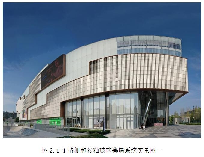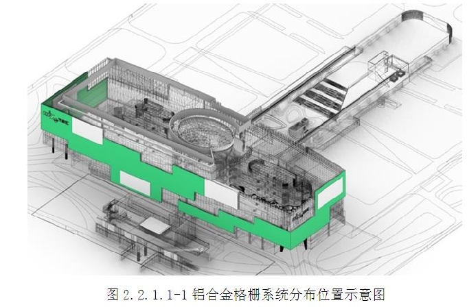 建筑整體外觀設計與周圍環境相融合,建筑幕墻外立面前后錯動,通過巧妙的結構和色彩對比形成凹凸有致的律動感。彩釉玻璃采用了大面板設計,部分玻璃高度達到了6000mm,不僅具有通透性,還使建筑具有色彩和科幻現代感,增加了視覺上的美觀性和裝飾性;建筑二層以上立面采用裝飾格柵系統和彩釉玻璃幕墻系統交錯布置,鋁合金格柵設計具有多個自由角度、挺拔向上、整齊一致的效果,是幕墻設計及施工重難點部位。(圖2.1-1~圖2.1-2)