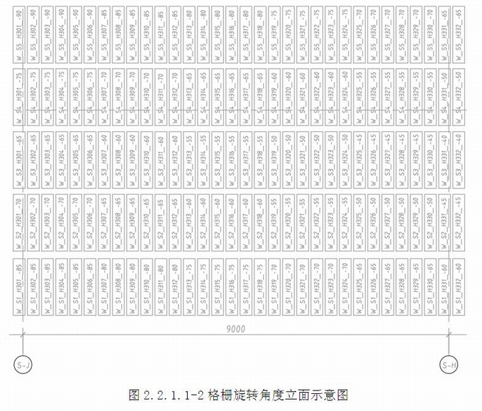 自由角度裝飾格柵,分布于建筑的東、南、西、北立面(圖2.2.1.1-1),由二層到屋頂檐口位置,層高5m。格柵豎向模數為1250mm,水平模數為300mm。鋁格柵共計1.7萬多件,格柵朝向角度極不規則,角度范圍0o~±90o,每隔一定度數為一個變化角度。如西立面,二層S-J軸位置,格柵豎向一列起始角度為-65~-90度,以其中起始-70度的一排格柵(格柵編號為:W_S2_H302_-70,編號最后面的數字為角度值)為例,從-70度開始每間隔6個相同角度后增加5度到-65度,然后排布6個-65度后,增加5度到-60度排布,同理逐步增加一直到0度(圖2.2.1.1-2~4)。格柵同排跟同列豎直方向的角度均不一致,如何精準保證格柵的朝向角度是設計及施工過程中的關鍵。