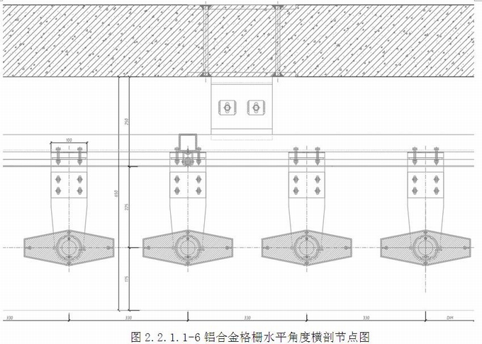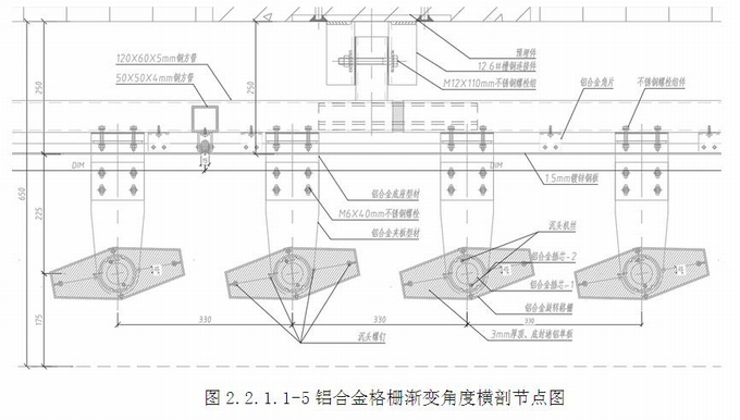 格柵系統整體構造:格柵截面為50~100x250mm,格柵采用鋁合金轉接件(詞條“轉接件”由行業大百科提供)與橫向鋼龍骨進行連接,格柵背部設置1.5mm鍍鋅鋼板,抹膠密封,作為防水立面,從鍍鋅鋼板縫中挑出T型鋁合金底座,用于連接格柵,通過鋁合金插芯調節格柵的角度。(圖2.2.1.1-5~7)