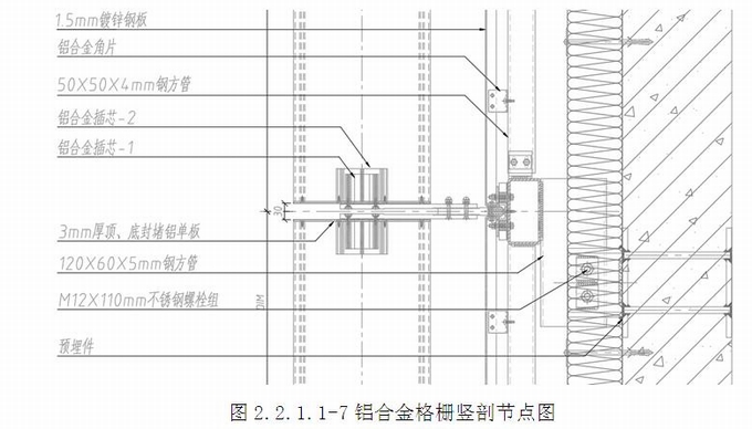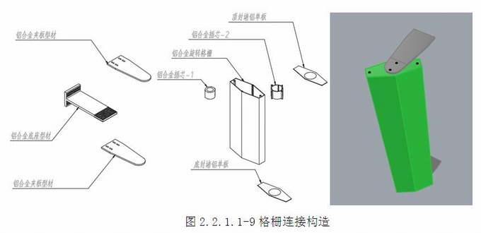 格柵連接構造:鋁合金底座型材(詞條“型材”由行業大百科提供)為T型,一端與龍骨立柱連接,一端與夾板型材連接。上下片鋁合金夾板型材與底座型材夾在一起。鋁合金旋轉格柵與鋁合金插芯-2連接;封堵鋁板開有圓孔,頂底封堵鋁板與格柵頂底連接進行封閉,形成完整的格柵片。鋁合金夾板型材與鋁合金插芯-1連接后,完整的格柵片與鋁合金插芯-1進行插接,形成懸挑格柵系統。鋁合金底座可實現上下、左右、前后方位調節,插芯-1可實現各種角度的旋轉調節。(圖2.2.1.1-9)