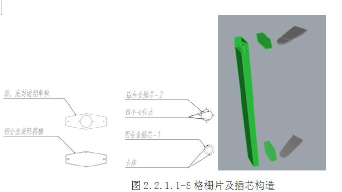 格柵片及插芯構造:格柵片截面設置兩螺釘孔眼及兩連接卡槽,鋁合金插芯-2內腔設置四個卡位點,外側設置兩螺釘孔眼及兩插翅,頂、底封堵鋁單板中部設置大圓孔,兩側設置螺釘孔。鋁合金插芯-2的插翅與格柵的卡槽進行卡接,后與封堵鋁單板進行連接,通過封堵鋁單板的四個螺釘孔旋入沉頭螺釘(圖2.2.1.1-8)。