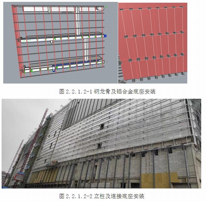 (1)放網格控制線(垂直、水平)作為鋼龍骨安裝依據,鋼龍骨精確定位(水平、進出、左右);放網格控制線(垂直、水平)作為鋁合金底座安裝依據,鋁合金底座精確定位(水平、進出、左右)(圖2.2.1.2-1~3)。
