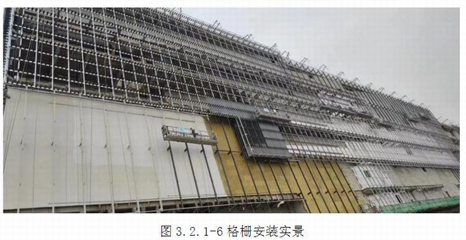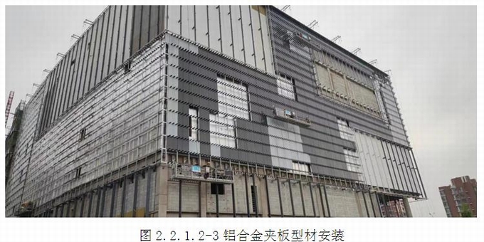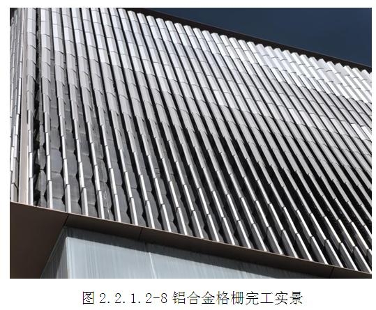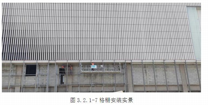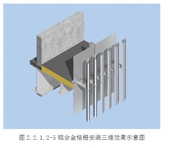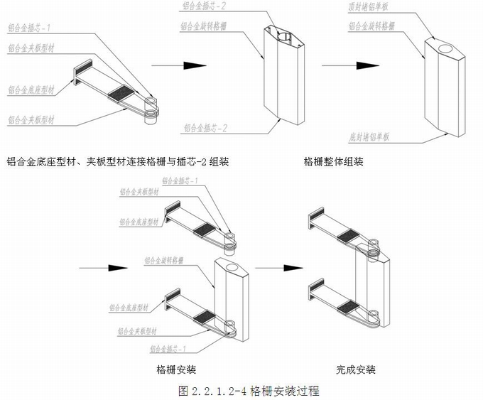 (4)將帶有鋁合金插芯-1的上部鋁合金夾板型材插入格柵頂部的鋁合金插芯-2,快速完成安裝。格柵現場安裝順序為從左到右,從下到上安裝。(圖2.2.1.2-4~8)