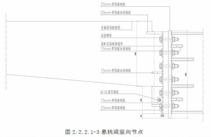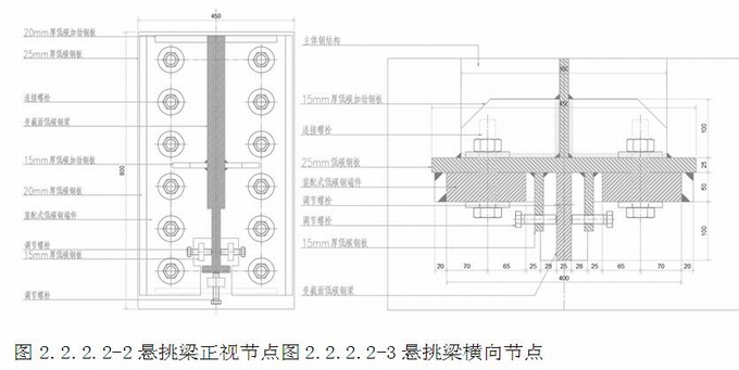 變截面低碳鋼懸挑梁構造:變截面低碳鋼(詞條“碳鋼”由行業大百科提供)懸挑梁與低碳鋼端件焊接成整體,2塊20mm厚低碳加勁鋼板和2塊15mm厚低碳加勁鋼板分別焊接在懸挑梁兩側,提高懸挑梁的穩定性,以上組成懸挑梁的整體,稱為變截面懸挑結構,懸挑結構通過螺栓固定在主體結構支撐上。(圖2.2.2.1-3~4)
