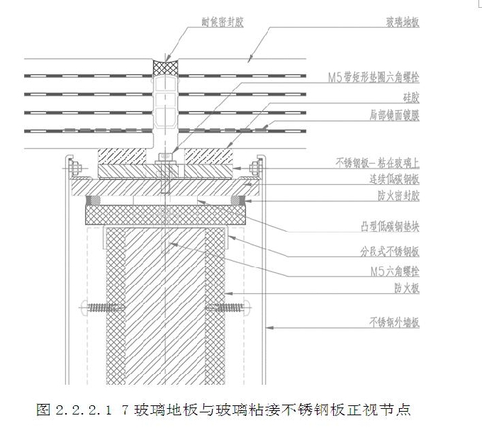 玻璃地板構造:8mm不銹鋼板作為副框安裝在玻璃地板上,整體俯視為凹凸造型,副框地板玻璃拼裝時,兩片玻璃的凹凸塊相互契合,各自形成連接塊。凸塊上設有一個長條孔,在凸塊表面設置2mm厚鋼墊片(詞條“墊片”由行業大百科提供),鋼墊片上設有一個大圓孔和兩個小圓孔,2個M5的螺栓通過鋼墊片與凸塊連接,長條孔的設置,使得地板可在平面內進行安裝定位調節,調節完畢后,通過大圓孔往凸塊的長條孔內灌環氧樹脂膠,進行固定,大圓孔為灌漿孔,兩個小圓孔為排氣孔,保證環氧樹脂膠充滿長條孔。灌漿設計使得結構牢固,安裝簡便,全過程無焊接作業。(圖2.2.2.1-5~7)