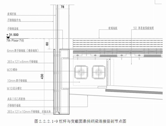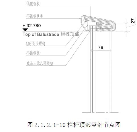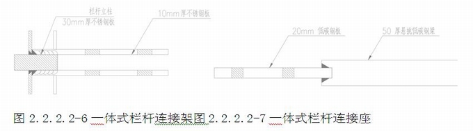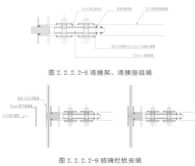 一體式欄桿構造:2塊10mm厚不銹鋼板組成夾具,一端夾在欄桿立柱上(焊接固定),5塊6mm厚不銹鋼板組成整體鋼架。1塊365×121×6mm不銹鋼板、2件鋼架、1塊365×121×10mm不銹鋼板(欄板托塊)組成玻璃槽,形成一體式欄桿連接架。懸挑梁前端開有凹口,組合件中230×150×20mm低碳鋼板插到凹口內,焊接固定,形成連接座。(圖2.2.2.1-8~10)