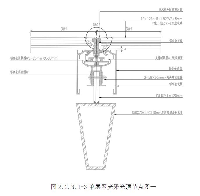單層網殼采光頂為空間雙曲面造型,采用雙面鋁單板與玻璃間隔布置的形式,鋼結構桿件為150x70x250x10mm厚熱軋梯形鋼龍骨;12mm厚鋼板焊接中心件,中心件采用鑄鋼件,四周采用150x70x250x10mm厚熱軋梯形鋼龍骨,鋼件與鋼件及龍骨之間采用坡口等強連接。支座(詞條“支座”由行業大百科提供)鋼件與鋁合金底座連接,可調節鋁合金底座的高低,定位后通過螺釘擰緊固定;支撐輔助型材通過鋁合金壓塊固定在底座上,支撐輔助型材與鋁合金邊框連接一端設置有球頭構造,鋁合金邊框設置有凹槽構造,球頭嵌入凹槽里面,可調節采光頂面板的角度。(2.2.3.1-3~5)