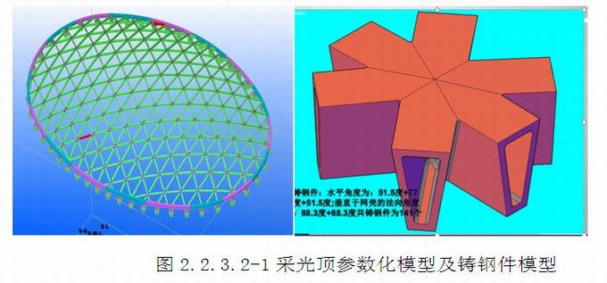 (1)建立采光頂鋼結構的參數化模型,生成鋼構(詞條“鋼構”由行業大百科提供)件加工圖。本項目單層網殼采光頂鋼結構節點采用“鑄鋼件”形式,鑄鋼件數量共141個,通過鑄鋼件與桿件進行拼接,有效提高拼裝效率,保證安裝精度及質量。(圖2.2.3.2-1~3)
