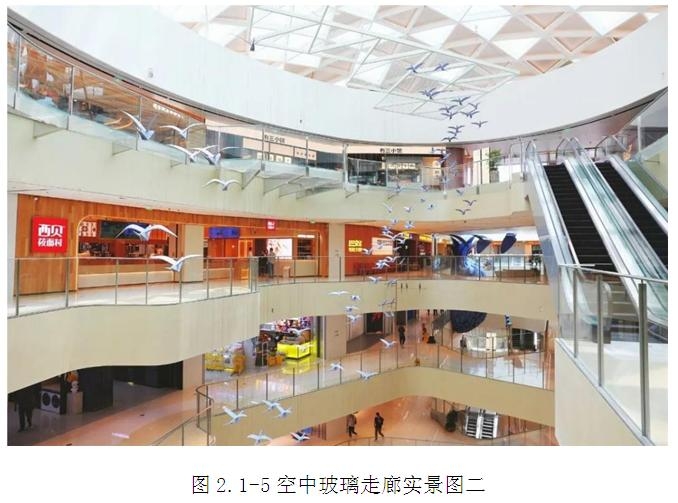 建筑室內打造了如同云端漫步的Skywalk空中玻璃走廊,走廊位于項目的頂層,橫跨整個商業綜合體,連接了不同的購物區域和休閑空間。走廊構造上采用全玻璃設計,不僅提供了極佳的視野,同時也增強了項目的現代感和科技感。走廊與向陽生長的藍色飛鳥、充滿異域情調的懸浮菠蘿以及通透晶瑩的采光頂天窗相互融合,為消費者提供了一個獨特的休閑空間。玻璃走廊采用高強度玻璃和鋼結構構造,確保了其堅固性和安全性。面板均為異形的超大玻璃,尺寸達2000x4500mm,且每塊尺寸都不一樣,同時支撐玻璃地板的變截面鋼梁懸挑最大尺寸達到4.5米,是設計及施工的重難點部位。(圖2.1-4~圖2.1-5)