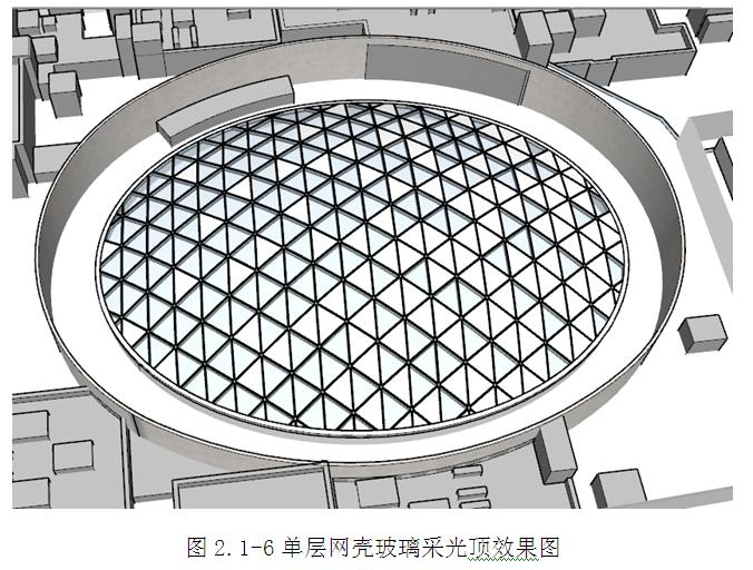 屋頂位置設置3個采光頂:1個單層網殼鋼結構玻璃采光頂,2個平面異形鋼結構玻璃采光頂。采光頂為玻璃及鋁單板組合,面板采用10+12Ar+8+1.52PVB(詞條“PVB”由行業大百科提供)+8mm中空三銀Low-E彩釉夾膠玻璃,龍骨采用焊接直角鋼龍骨,表面采用防腐底漆+防火涂料,鋼龍骨外側設置鋁合金底座轉接調節,排水方式為全隱無組織外排。(圖2.2.3.1-1~2)
