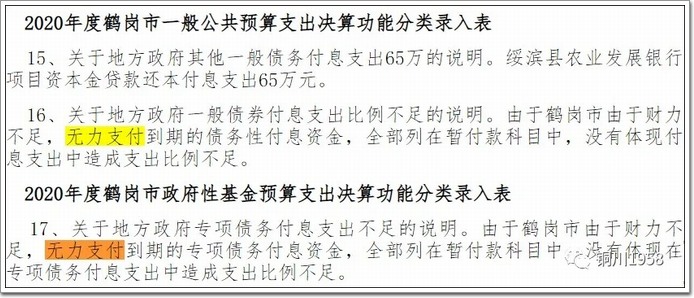不過(guò),2020年度鶴崗市財(cái)政總決算強(qiáng)審說(shuō)明提到,鶴崗市由于財(cái)力不足,無(wú)力支付到期的債務(wù)性/專項(xiàng)債務(wù)付息資金,全部列在暫付款科目中,沒有體現(xiàn)在付息支出/專項(xiàng)債務(wù)付息支出中造成支出比例不足。