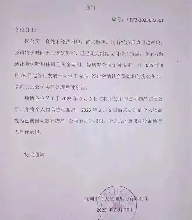 2025年8月26日,一份由深圳海大裝飾集團有限公司發(fā)布的《通知》在互聯網廣泛傳播。該文件顯示,因公司長期無法恢復正常生產經營,已無力繼續(xù)支付員工停工待遇,同時停止繳納社會保險及住房公積金。公司決定自即日起停發(fā)所有停工待遇,并通知員工返司協商后續(xù)安置方案。