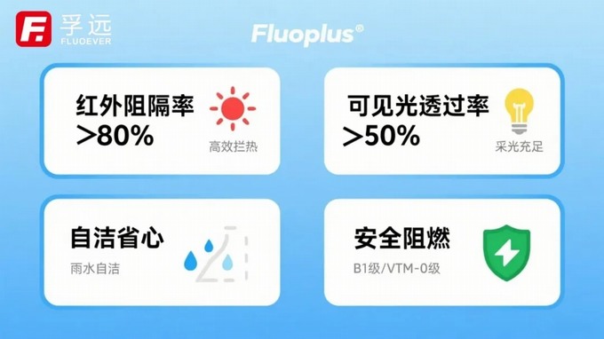 Fluoplus®紅外阻隔 ETFE 薄膜的推出,不僅體現(xiàn)了上海孚加新材在材料研發(fā)領(lǐng)域的創(chuàng)新實(shí)力,更契合了當(dāng)下 “雙碳” 目標(biāo)下綠色建筑的發(fā)展趨勢(shì)。