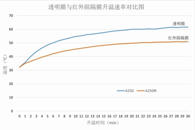 由此可見(jiàn):紅外阻隔膜(A250IR)的升溫速率顯著低于透明膜(A250),隔熱控溫效果顯著。
