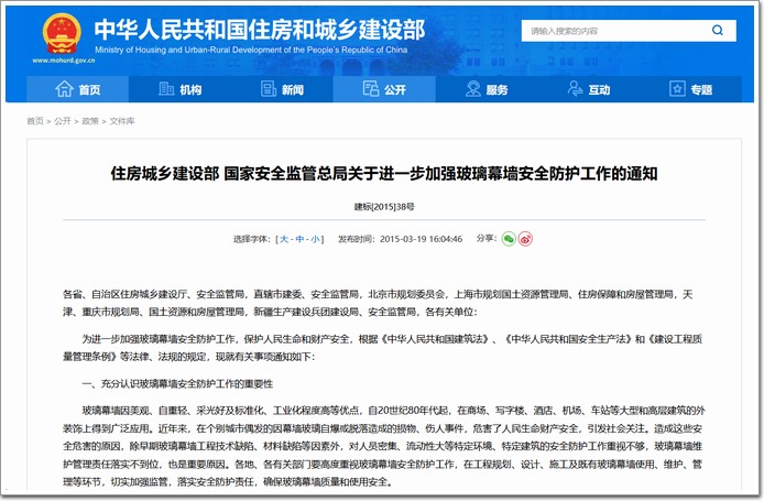 然而,伴隨越來越多新建幕墻工程的投入使用,以及現(xiàn)有建筑幕墻老齡化的到來,既有建筑幕墻的安全問題受到了社會廣泛關(guān)注!國家管理層面早在2015年就出臺了《關(guān)于進(jìn)一步加強(qiáng)玻璃幕墻安全防護(hù)工作的通知》(建標(biāo)【2015】38號),該通知由住房城鄉(xiāng)建設(shè)部和國家安全總局聯(lián)合發(fā)布。