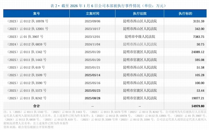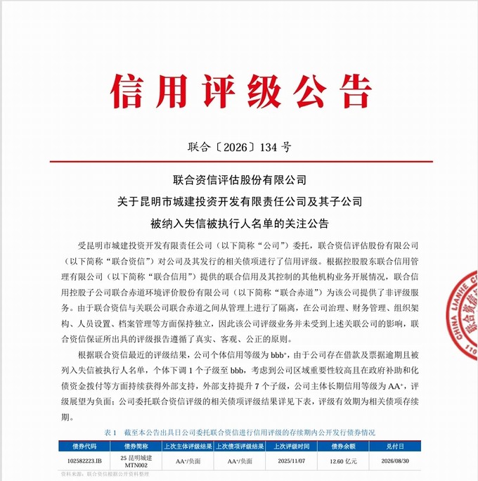 2026年1月8日,聯合資信發布公告關注昆明市城建投資開發有限公司及其子公司被納入失信被執行人名單:
