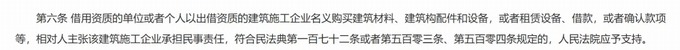 第六條 借用資質(zhì)的單位或者個(gè)人以出借資質(zhì)的建筑施工企業(yè)名義購買建筑材料、建筑構(gòu)配件和設(shè)備,或者租賃設(shè)備、借款,或者確認(rèn)款項(xiàng)等,相對(duì)人主張?jiān)摻ㄖ┕て髽I(yè)承擔(dān)民事責(zé)任,符合民法典第一百七十二條或者第五百零三條、第五百零四條規(guī)定的,人民法院應(yīng)予支持。