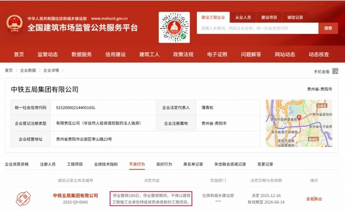 近日,據四庫平臺顯示,中鐵五局集團有限公司被住房和城鄉建設主管部門處以停業整頓180日的行政處罰。