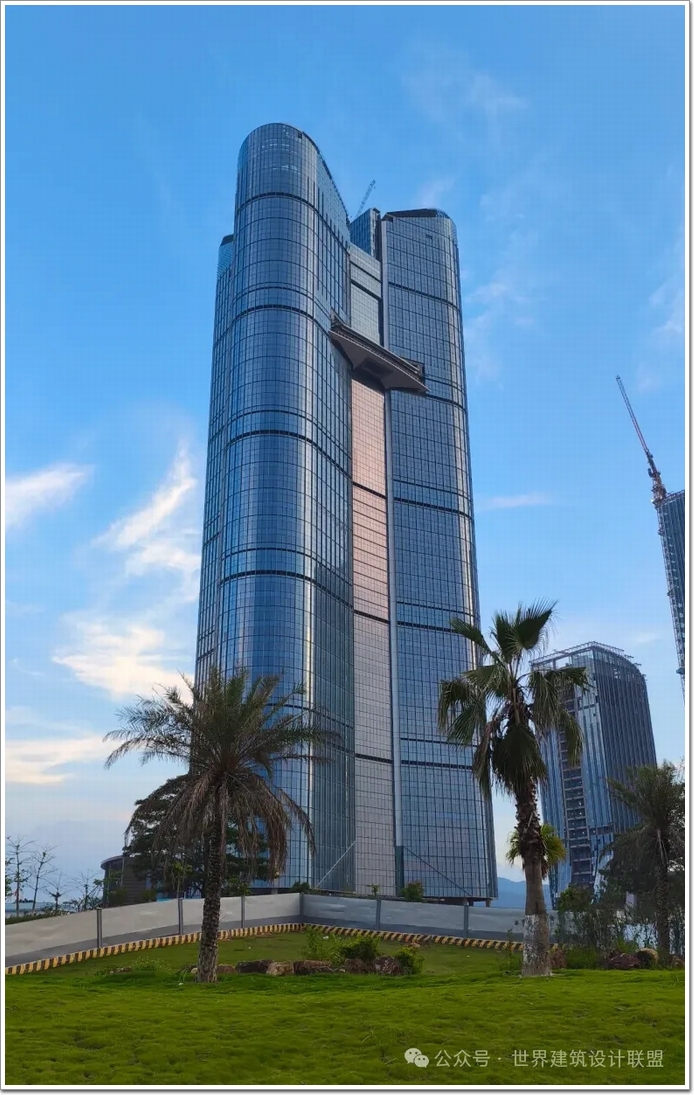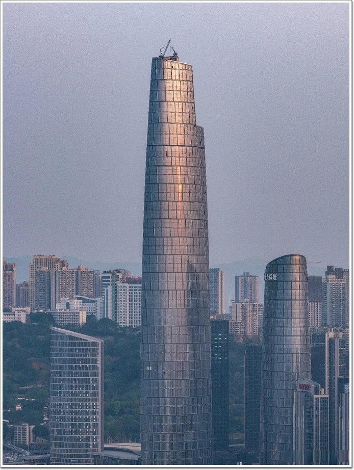 隨著塔冠幕墻的順利封頂,設計形象完美兌現:從遠處看上去塔樓上部的退臺,宛如上山階梯蜿蜒瀉下的瀑布,與周邊建筑錯落有致,形成一種眾星捧月的效果。