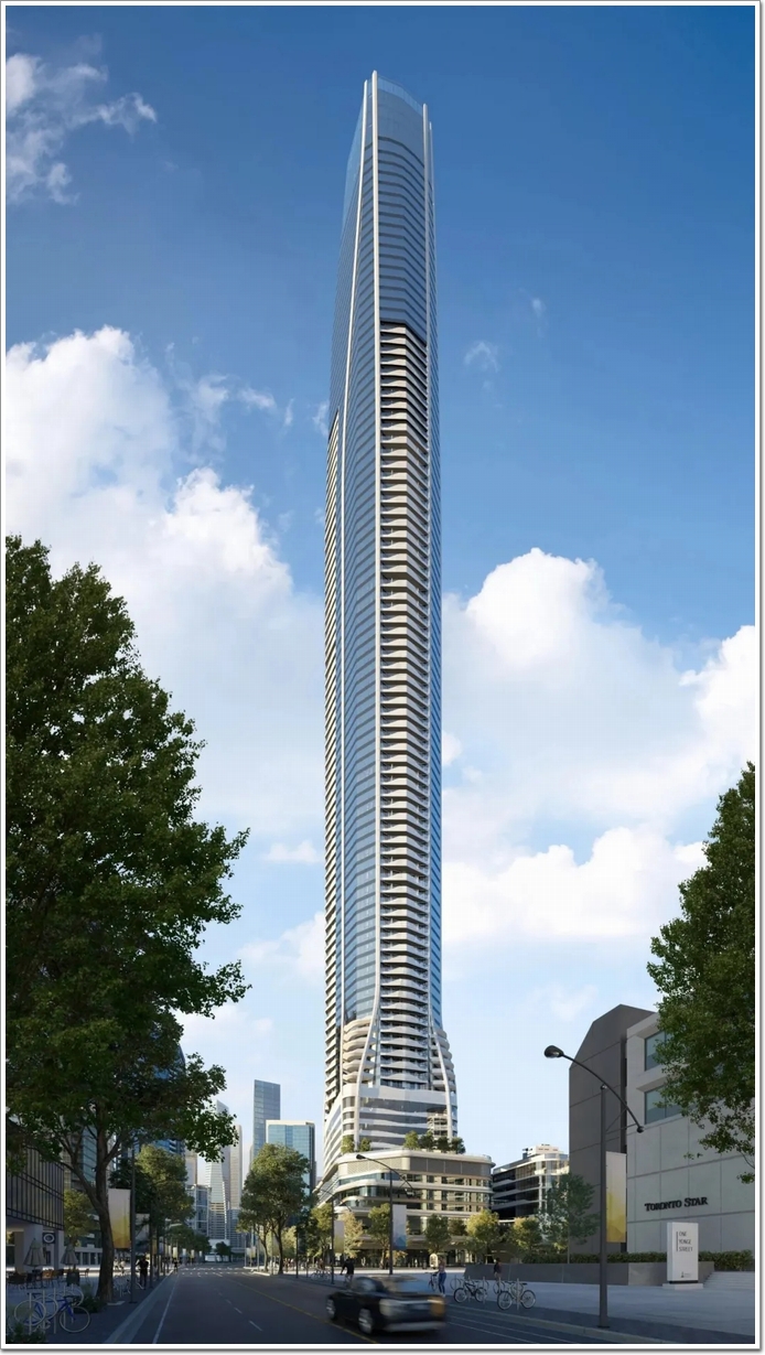 該項目由國際知名建筑事務所Hariri Pontarini Architects設計。塔樓頂部與CN塔觀景臺平齊,既尊重傳統地標,又以流線型玻璃幕墻和白色垂直鰭片塑造現代感。建筑底部通過多層裙樓與Yonge街歷史街區融合,實現了“垂直城市”與地面社區的有機銜接。