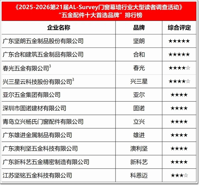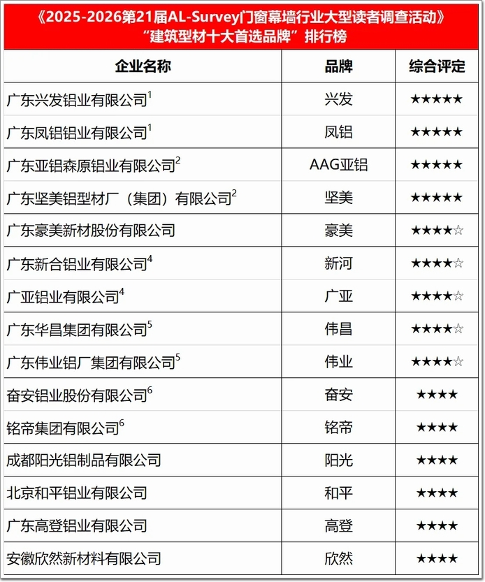 榜單由來自“TOP10”鋁型材企業(yè)、“TOP10”幕墻企業(yè)、“TOP10”門窗企業(yè)為代表的材料、成本負(fù)責(zé)人,針對產(chǎn)品質(zhì)量\服務(wù)水平的維度進(jìn)行評審、打分。同時,匯總來自行業(yè)專家、省市協(xié)會從品牌價值\業(yè)界口碑,以及綜合設(shè)計院、顧問公司對其技術(shù)創(chuàng)新\解決方案的評價。