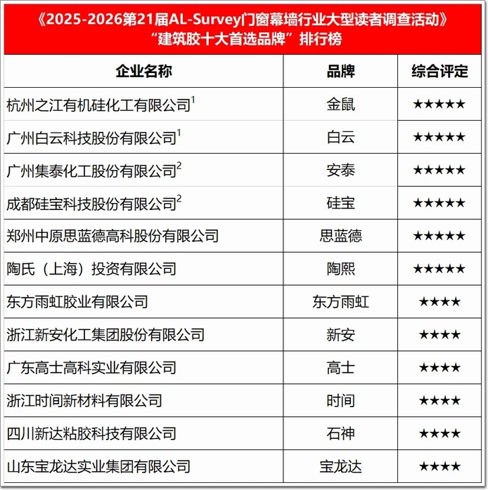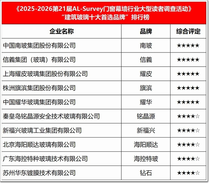 榜單由來自“TOP20”幕墻企業(yè)、“TOP10”門窗企業(yè)、“TOP10”房地產(chǎn)企業(yè)為代表的材料、成本負(fù)責(zé)人,針對產(chǎn)品質(zhì)量\服務(wù)水平的維度進(jìn)行評審、打分。同時,匯總來自行業(yè)專家、省市協(xié)會從品牌價值\業(yè)界口碑,以及綜合設(shè)計院、顧問公司對其技術(shù)創(chuàng)新\解決方案的評價。