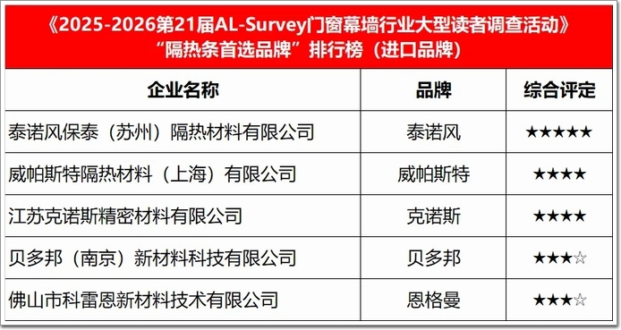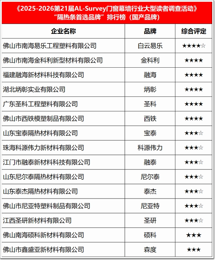 “隔熱條首選品牌”年度榜單(國產(chǎn))⇧