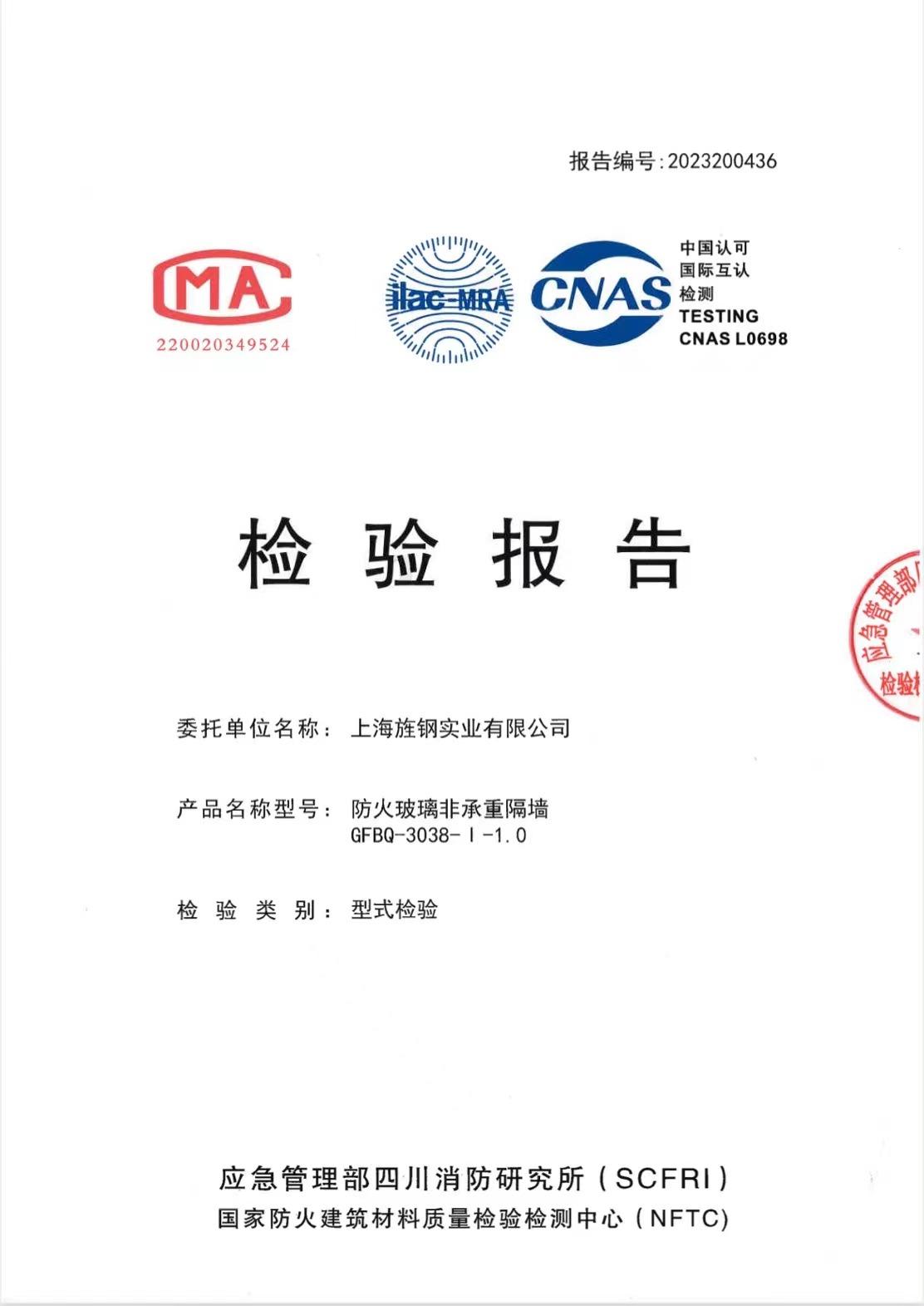 證書名稱: 防火玻璃非承重隔墻型式檢驗報告