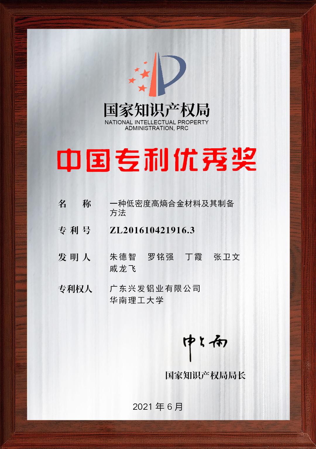中國專利優秀獎【一種低密度高熵合金材料及其制備方法】 |