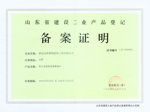 山東省建設工業產品登記備案證明 |