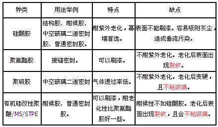 根據化學成分不同,建筑幕墻用密封膠可分為:硅酮類、聚氨酯類、硅烷改性聚醚類、聚硫類等。具體特性見下表: