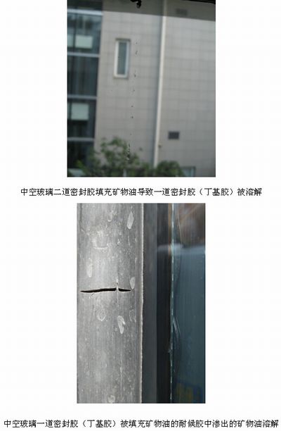 在長時間的紫外線和氣候老化作用下,質量好的硅酮密封膠能保持良好彈性、強度和粘接性,而質量差的密封膠會出現粉化或者硬化、收縮、開裂以及不粘接等問題,導致接縫密封失效,出現漏水情況。如果填充了礦物油的硅酮密封膠跟中空玻璃密封膠接觸,還會導致中空玻璃的密封失效!