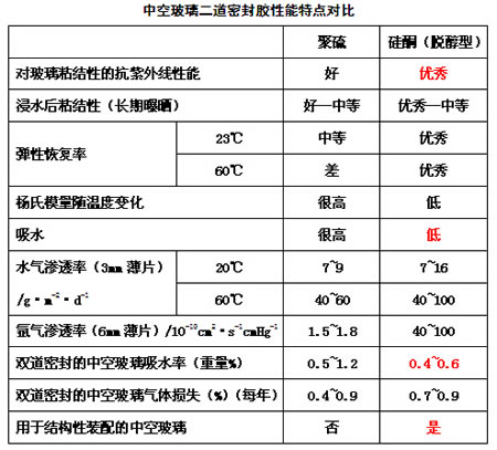 2、常用的中空玻璃二道密封膠有那些種類呢? 中空玻璃二道密封膠主要有聚硫和硅酮兩類,目前國內(nèi)市場上以硅酮為主。下表中列出了兩種膠完全固化后的一些特性。