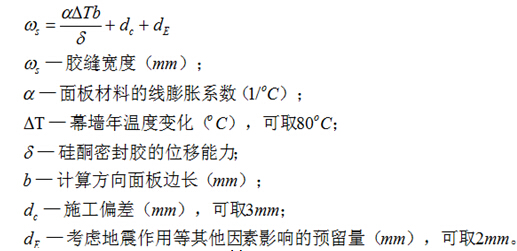 硅酮耐候膠的膠縫寬度應不小于6mm,并且應滿足板塊的變形要求,溫差變形可以按照《玻璃幕墻工程技術規范》JGJ 102第4.3.9規定進行計算,公式如下: