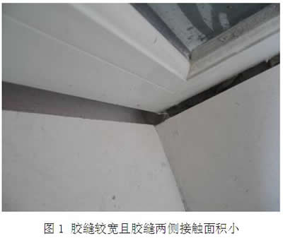 針對這類問題,可能原因有兩點:一是膠縫寬度較大,且膠與基材的接觸面積小,附著力不夠。注膠后,在膠未固化到一定程度時,如此時膠的重力大于膠的附著力,就可能會導致膠縫變形而出現垂流現象(見圖1)。二是密封膠本身下垂度指標較差而出現垂流現象。